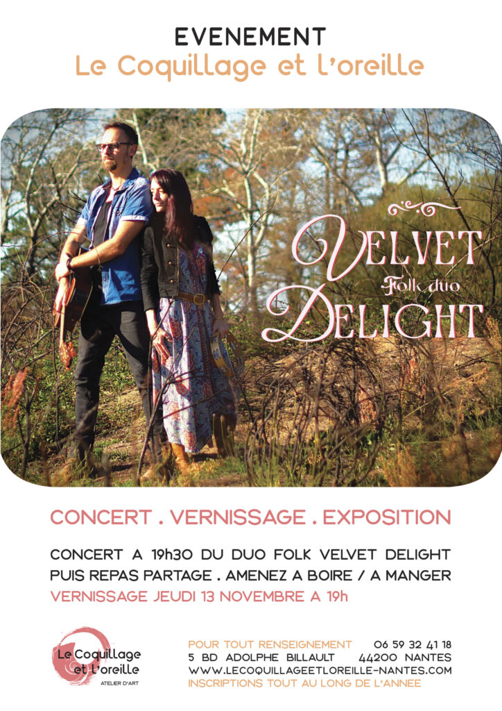 Nous aimons regrouper plusieurs évènements et ce soir là, ce sera le vernissage d’une petite exposition de peinture de Jeanne Leroux, peintre des années 80 et le concert intimiste des Velvet Delight. Chacun amène un petit quelque chose à manger et à boire et nous aurons la soirée pour discuter et apprécier !