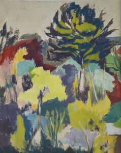C’est donc sur le tard que Jeanne étudie (1961-1965) à l’école des Beaux-Arts de Lorient auprès d’Henry Joubioux, autrefois grand voyageur et qui fut au long cours de ses pérégrinations asiatiques, portraitiste officiel de Ho Chi Minh ou encore de la famille royale du Cambodge et du Laos. Très tôt à l’atelier, Jeanne va préférer la peinture d’extérieur, planter son chevalet in media res et, ainsi, puiser l’inspiration à arpenter  » les sentiers tortueux et si pittoresques de notre séculaire Morbihan. » Qu’il s’agisse d’huiles sur toile ou sur papier, Jeanne Le Roux excellera à immortaliser les paysages de sa Bretagne natale, adoptant une touche assez large dans la construction et privilégiant la couleur.